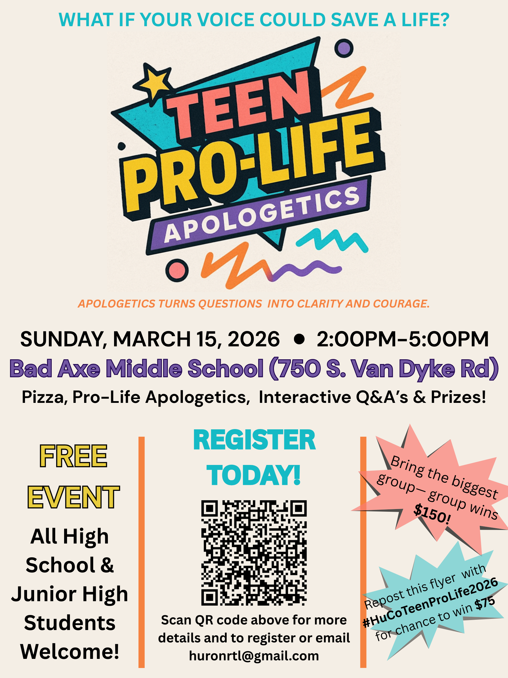 All High School & Junior High students are invited to attend Teen Pro-life Apologetics to learn what it means to be pro-life and how to have conversations about abortion rooted in truth and love. This FREE training will be held Sunday, March 15, from 2pm-5pm at the Bad Axe Middle School, doors open at 1:30pm. The largest group to attend wins $150. Repost the flyer with #HuCoTeenProLife2025 for a chance to win $75. Scan the QR code on the flyer for more details and & to register OR email your name, shirt size, and phone number to HURONRTL@gmail.com to register.